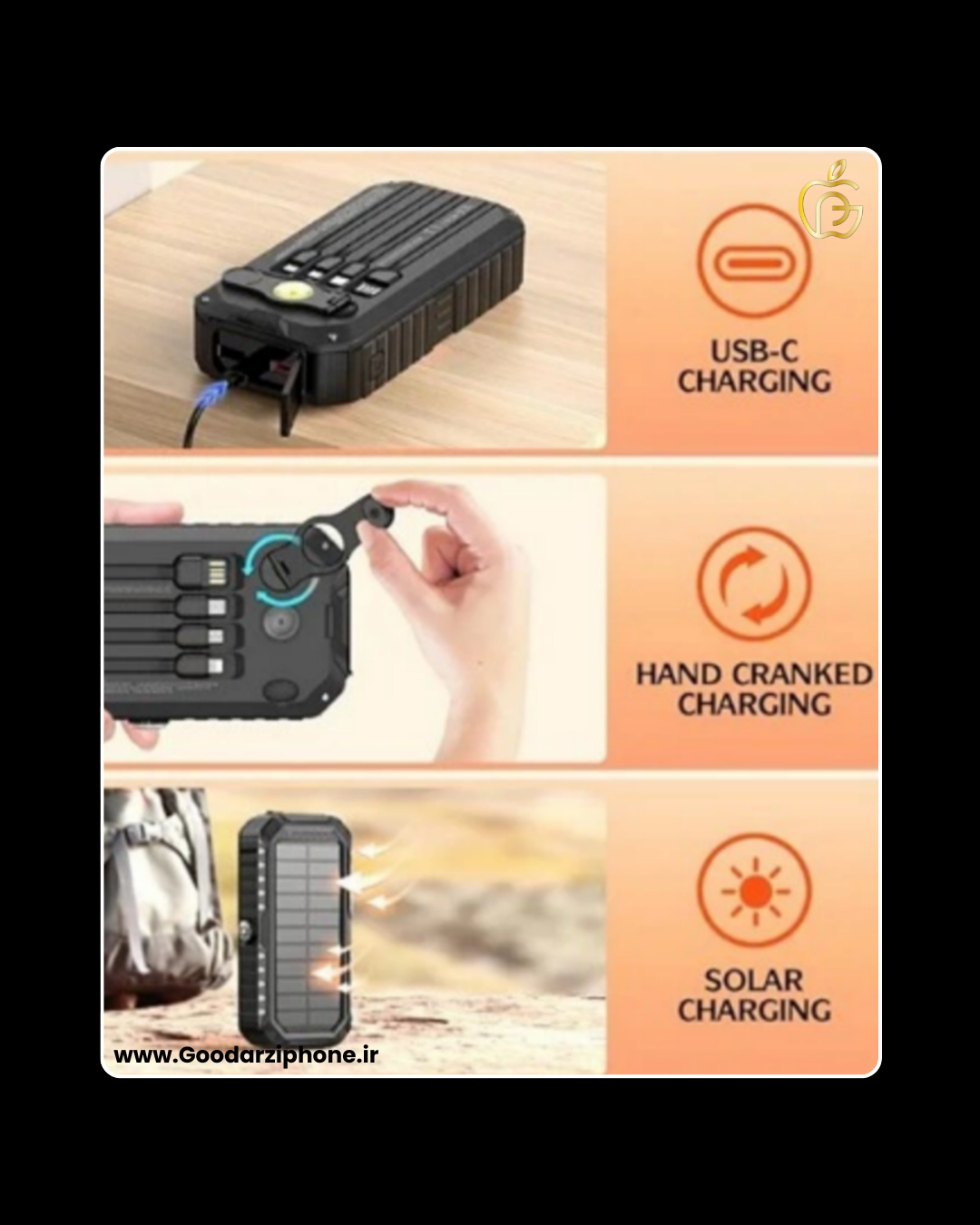🔸قابلیت شارژ پاوربانک از 4 طریق خورشیدی، کابل متصل، درگاه تایپ سی و میل لنگ دستی